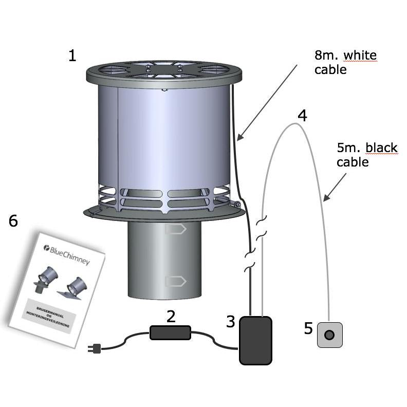 BlueChimney is placed at the top of the chimney. BlueChimney’s fan sucks the smoke up from the wood burning fireplace and mixes it with the air outside, while at the same time hurling the smoke high up above the chimney. BlueChimney’s fan is powered by a low-voltage motor made by one of the worlds’ leading motor manufacturers. It is connected with an ordinary power plug either indoors or outdoors. BlueChimney works in all types of weather, and a built-in rain hood prevents water entering the chimney.