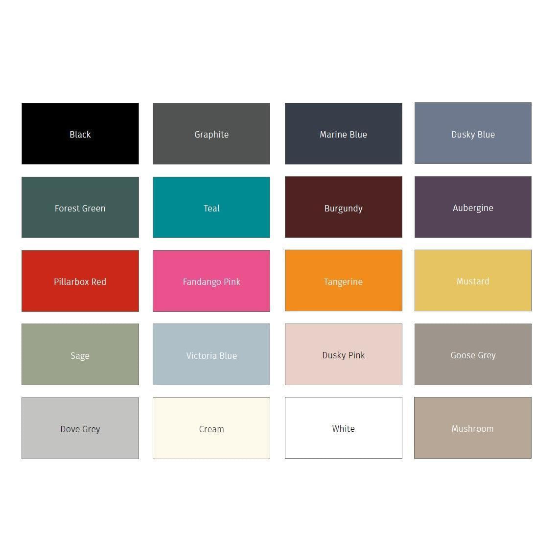 Available in 20 colours including: Black, Cream, Graphite, Marine Blue, Aubergine, Victoria Blue, Burgundy, Dove Grey, Sage, Dusky Pink, Tangerine, Teal, Pillarbox Red, White, Mustard, Dusky Blue, Goose Grey, Forest Green, Fandango Pink, Mushroom